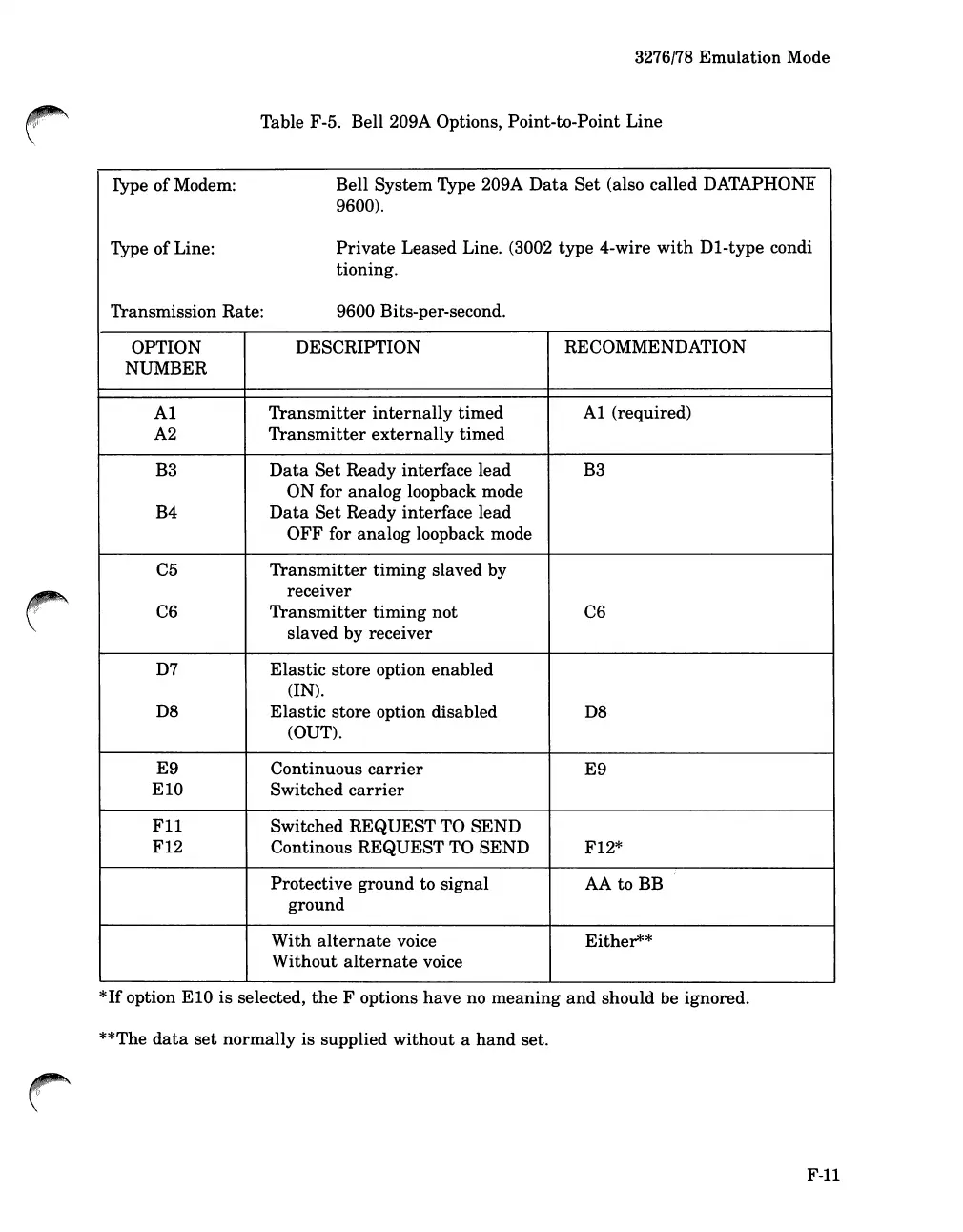 Table F-5. Bell 209A Options, Point-to-Point Line