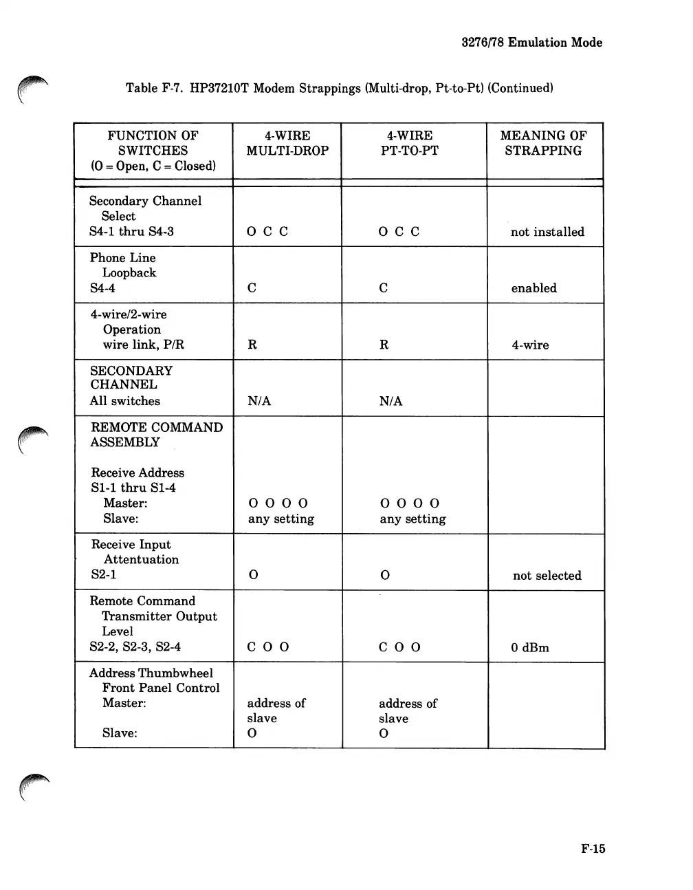 Table F-7. HP37210T Modem Strappings (Multi-drop, Pt-to-Pt) (Continued)