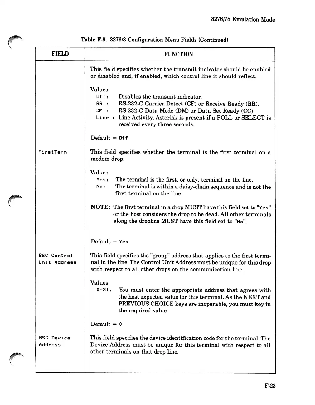 Table F-9. 3276/8 Configuration Menu Fields (Continued)