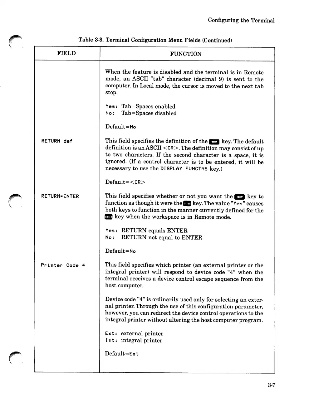 Terminal Configuration Menu Fields (Continued)