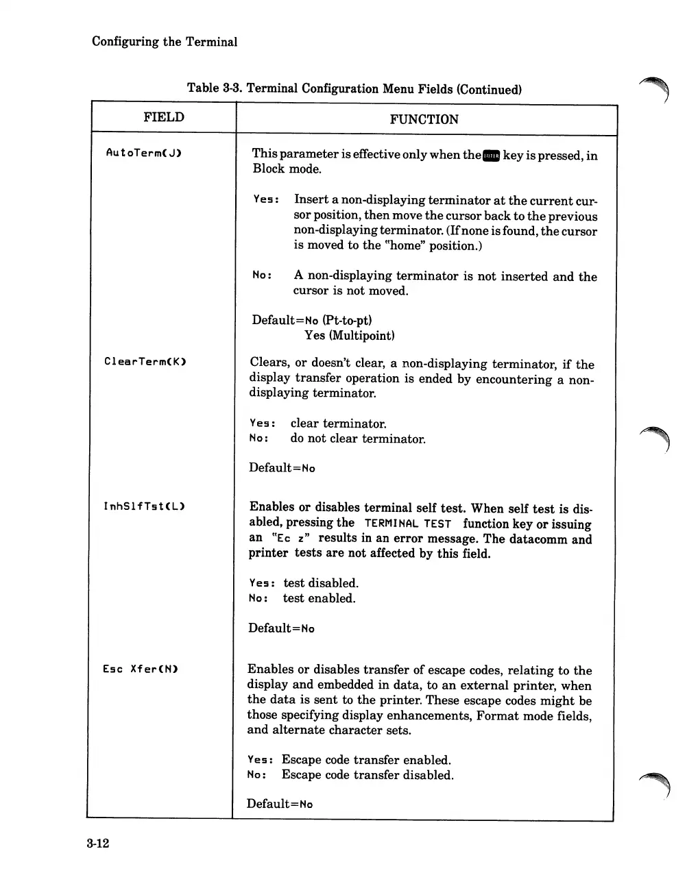 Terminal Configuration Menu Fields (Continued)