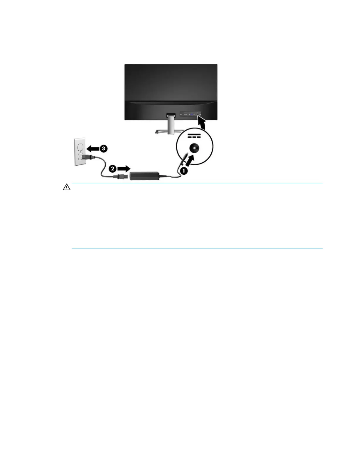 3. Connect the round end of the power supply cord to the monitor (1), and then connect one end of the
