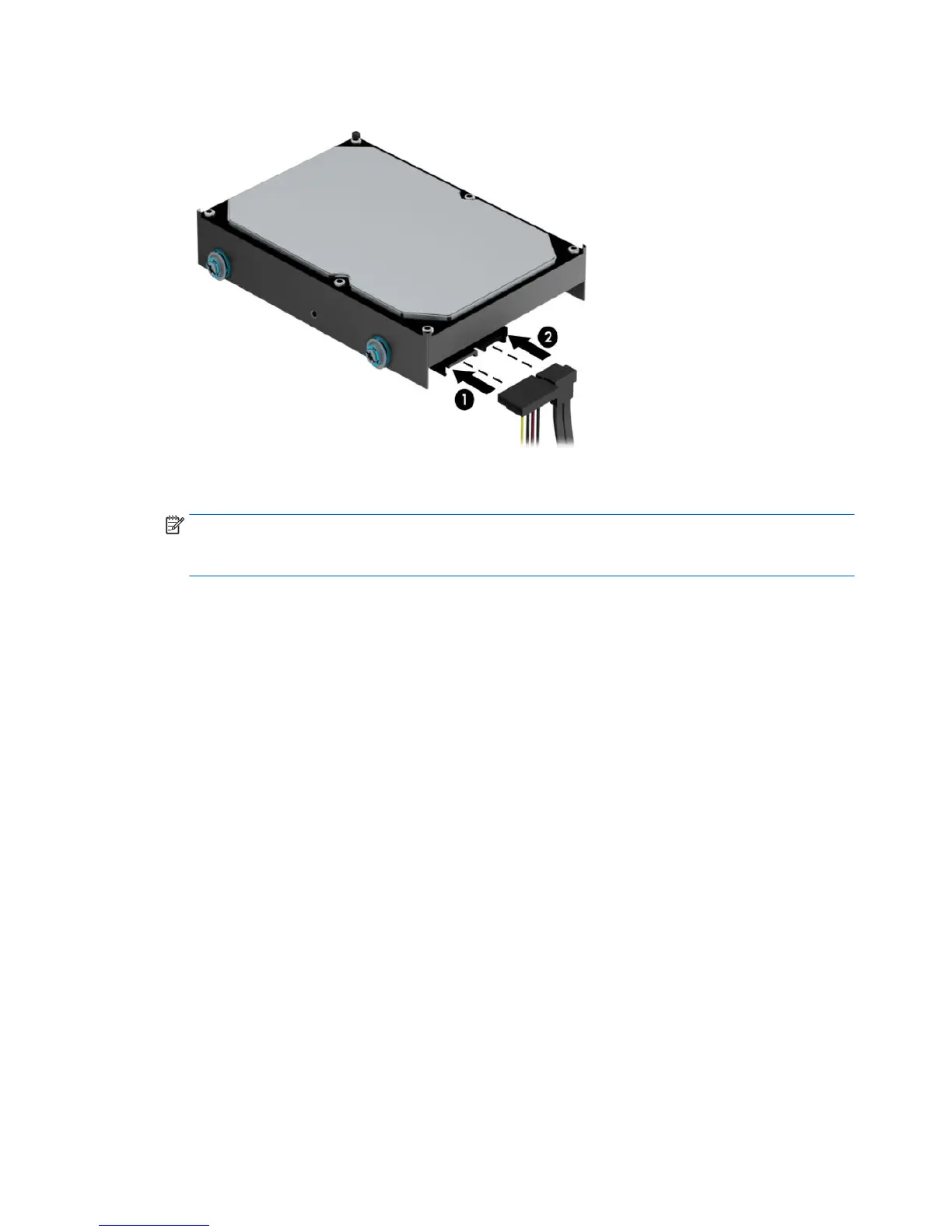 6. Connect the power cable (1) and data cable (2) to the rear of the hard drive.