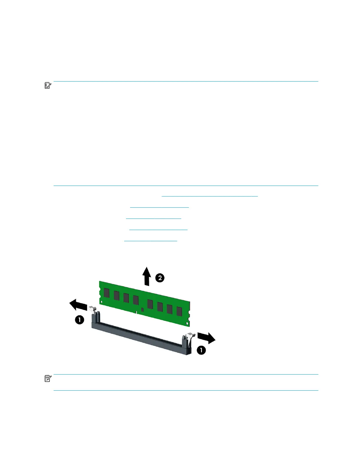 6. To remove a memory module, open both latches of the memory module socket (1), and then remove the