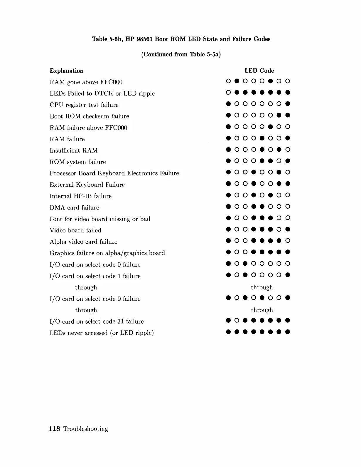Table 5-5b, HP 98561 Boot ROM LED State and Failure Codes