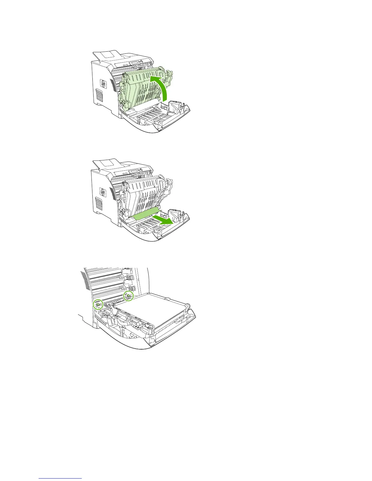 5. Locate the green registration-plate tabs that are below the bottom print cartridge.