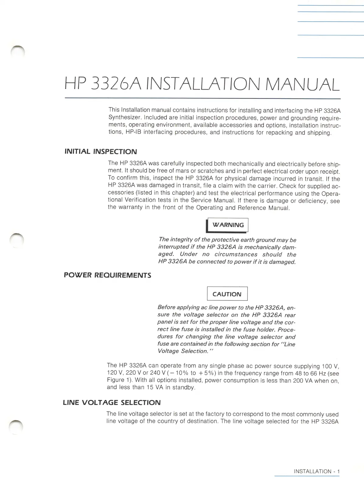 HP 3326A - Iwitial Inspection; Power Reouirements; Line Voltage Selection