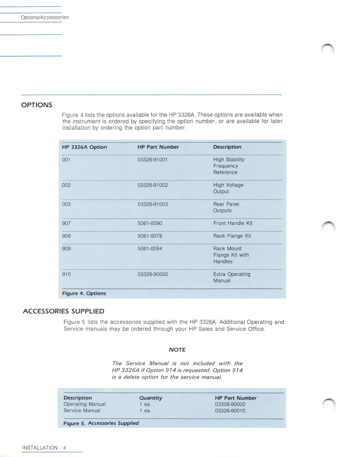 HP 3326A - Options; Accessories Supplied