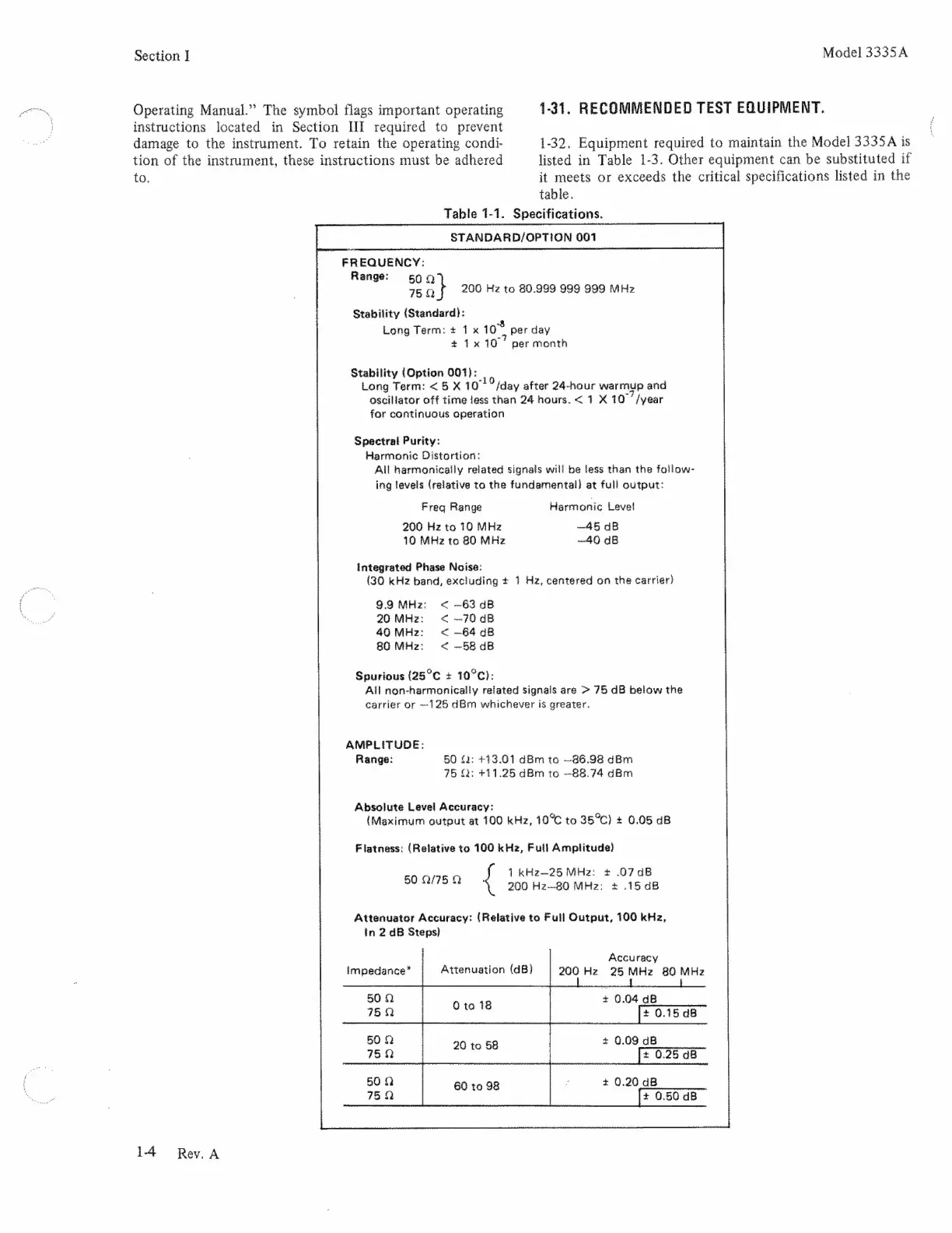 HP 3335A - Recommended Test Equipment; Test Equipment Recommendations