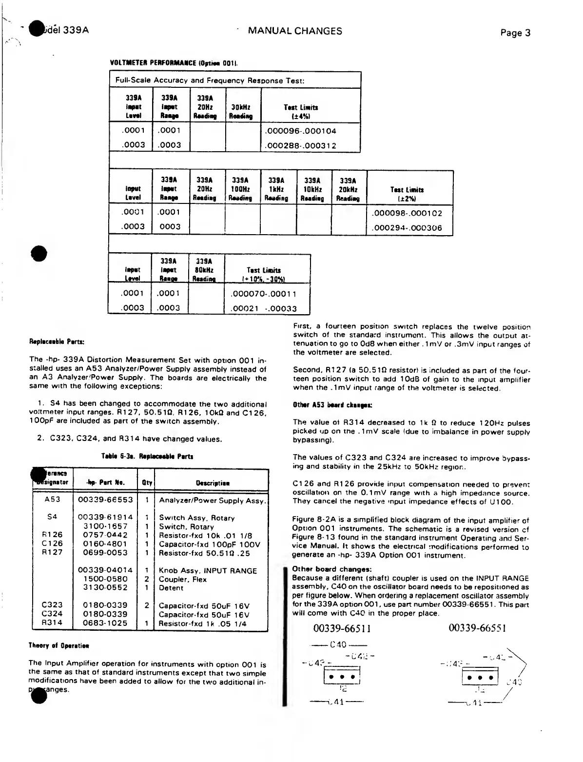HP 339A - Option 001 Voltmeter Performance and Parts; Option 001 Theory of Operation Notes