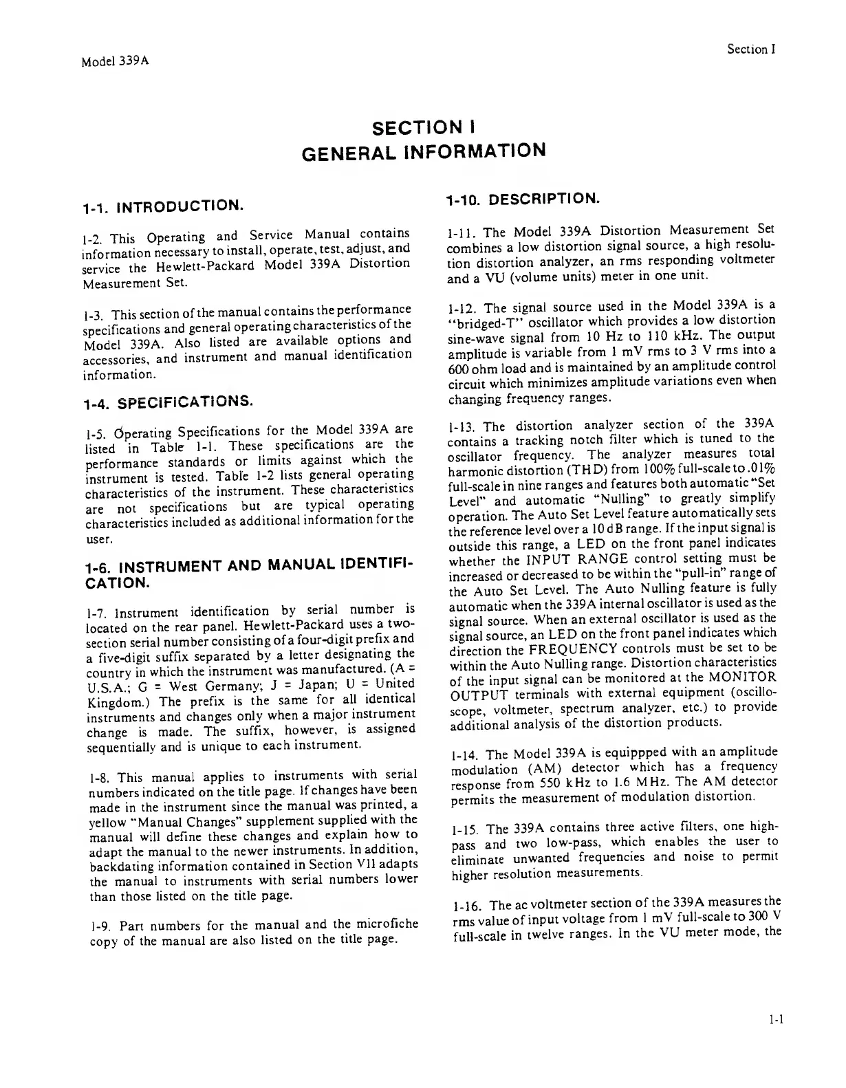 HP 339A - Section I General Information; Introduction and Specifications; Instrument Identification and Description