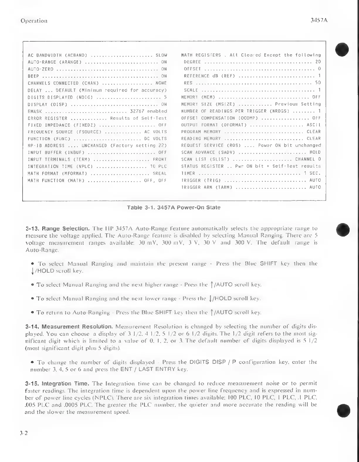 HP 3457A - 3-13. Range Selection; 3-14. Measurement Resolution; 3-15. Integration Time