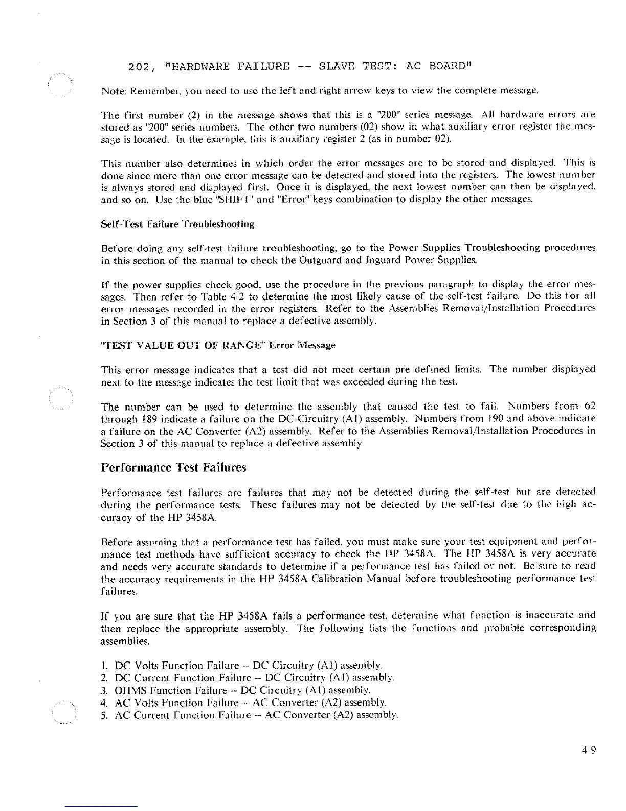 HP 3458A - Self-Test Failure Troubleshooting; Performance Test Failures