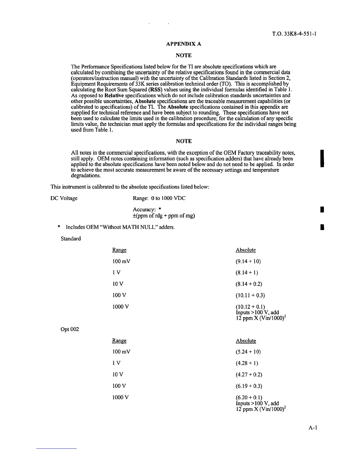 The Performance Specifications listed below for the TI are absolute specifications which are