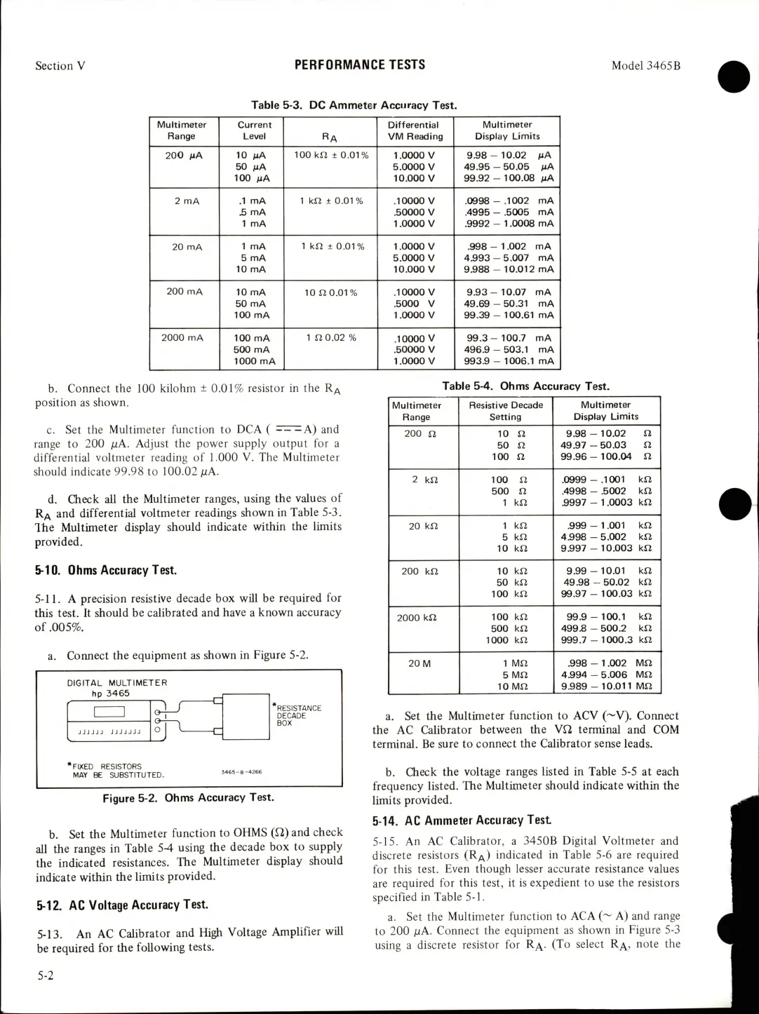 HP 3465B - Performance Tests; DC Ammeter Accuracy Test; Ohms Accuracy Test; AC Voltage Accuracy Test