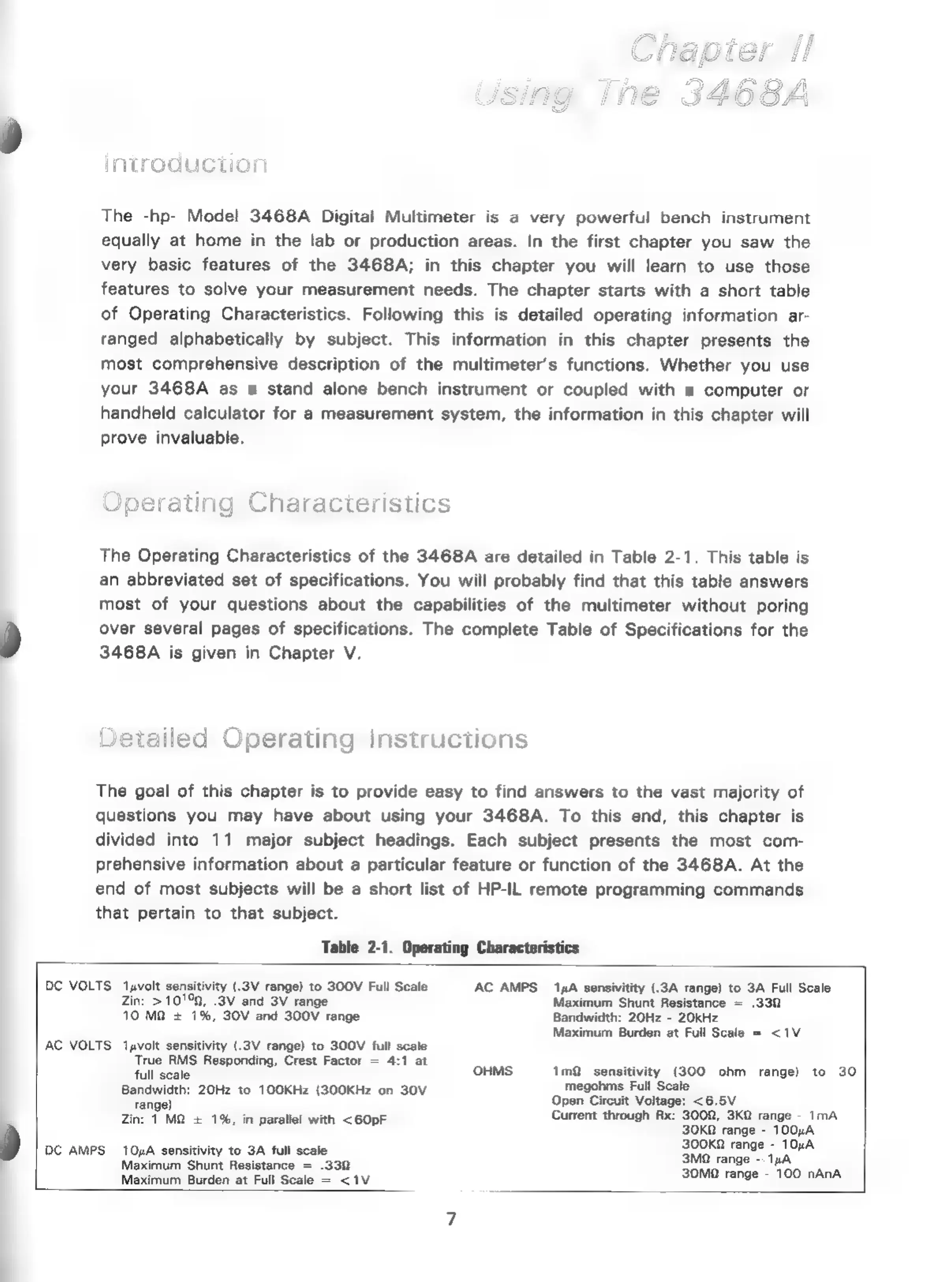 HP 3468A - Chapter II: Using The 3468 A; Introduction to 3468 A Operation; Operating Characteristics Overview; Detailed Operating Instructions