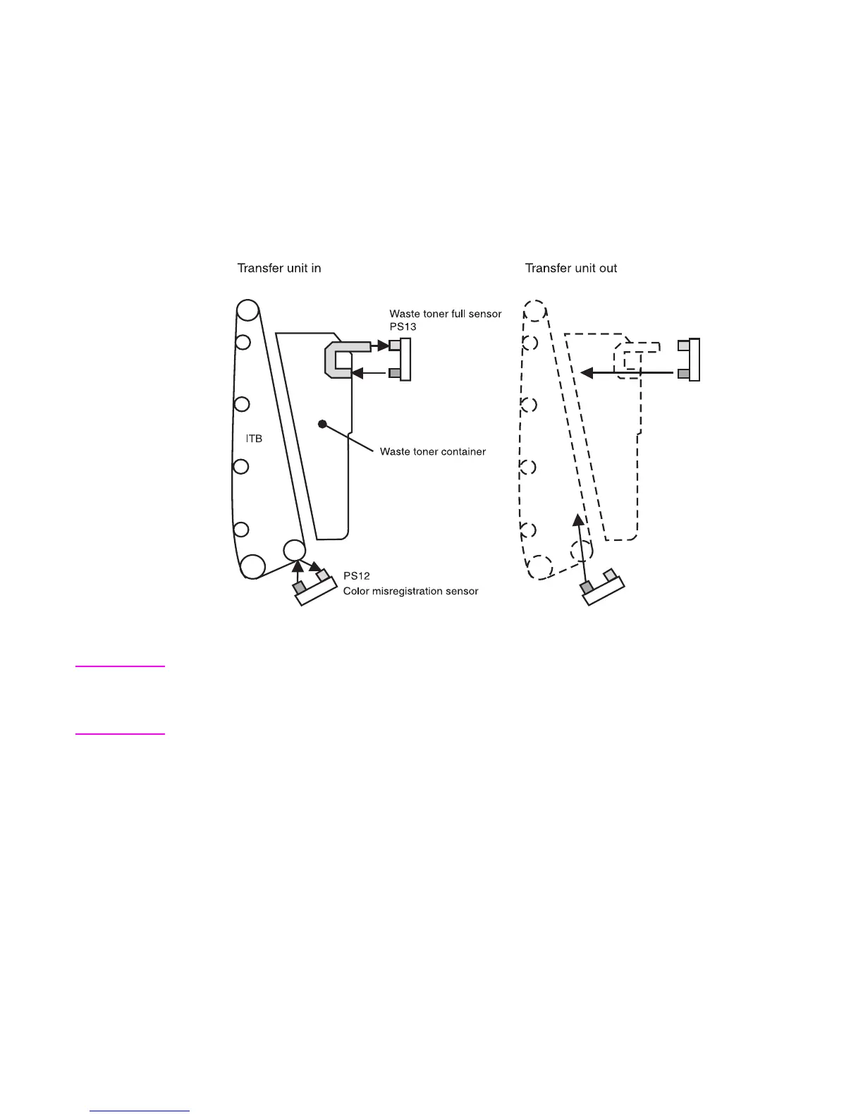 The DC controller monitors the waste toner full sensor (PS13) and color misregistration sensor
