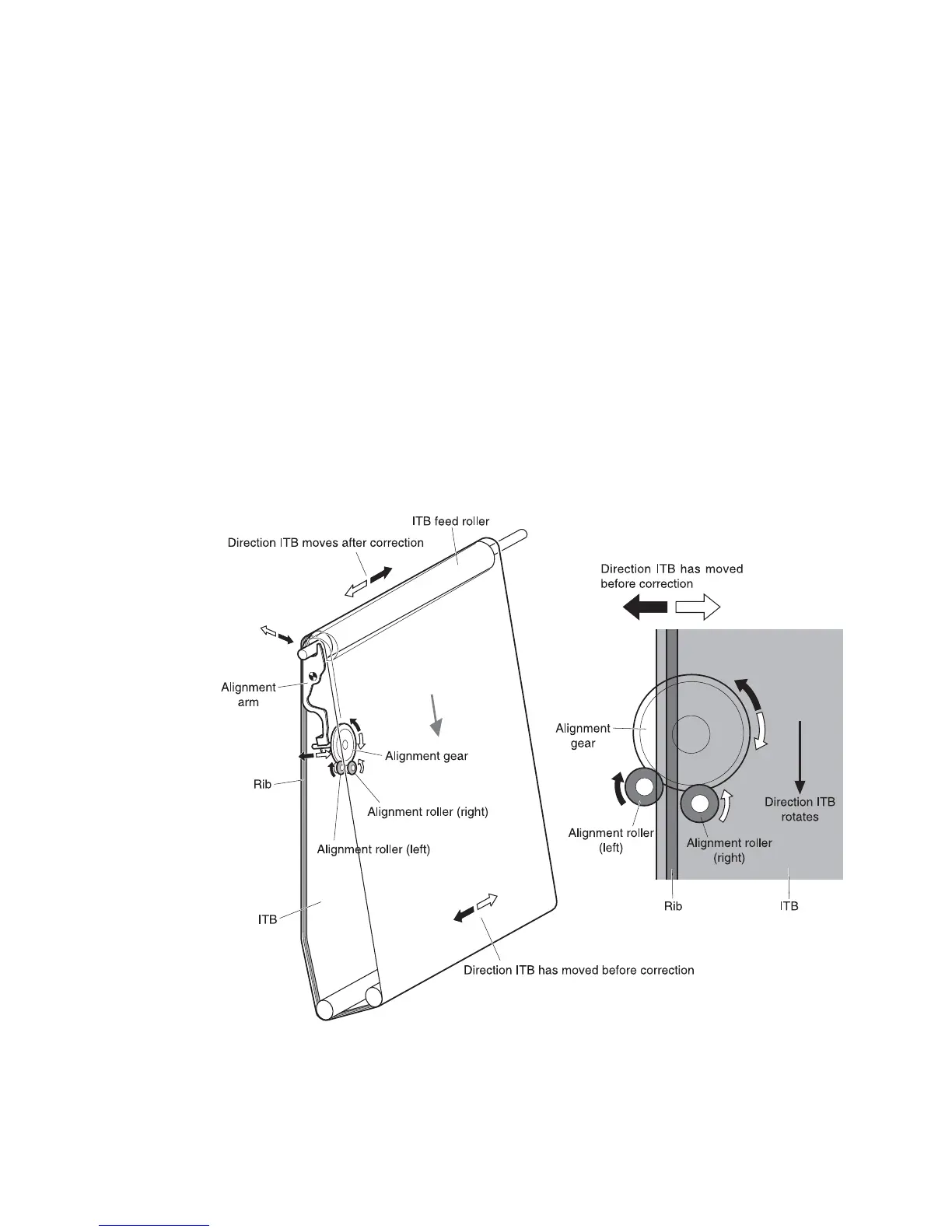 The alignment rollers, alignment gear, and alignment arm inside the ITB unit move the ITB feed