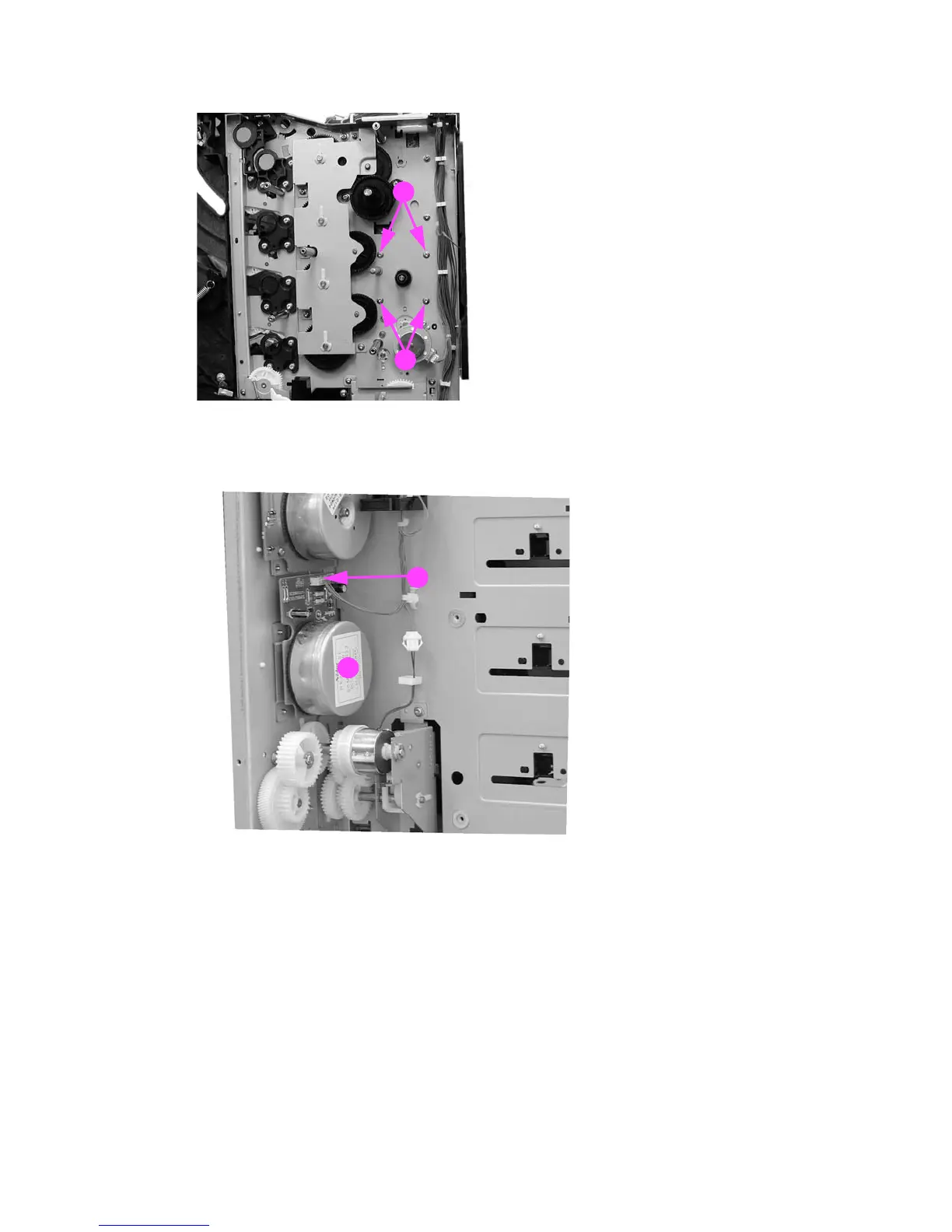 6 Disconnect one connector (1) and remove the developing motor (2).