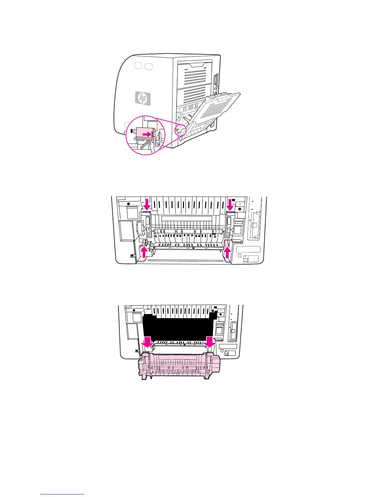 5. Remove the lower rear door (rear output bin) by lifting and pulling the right side of the