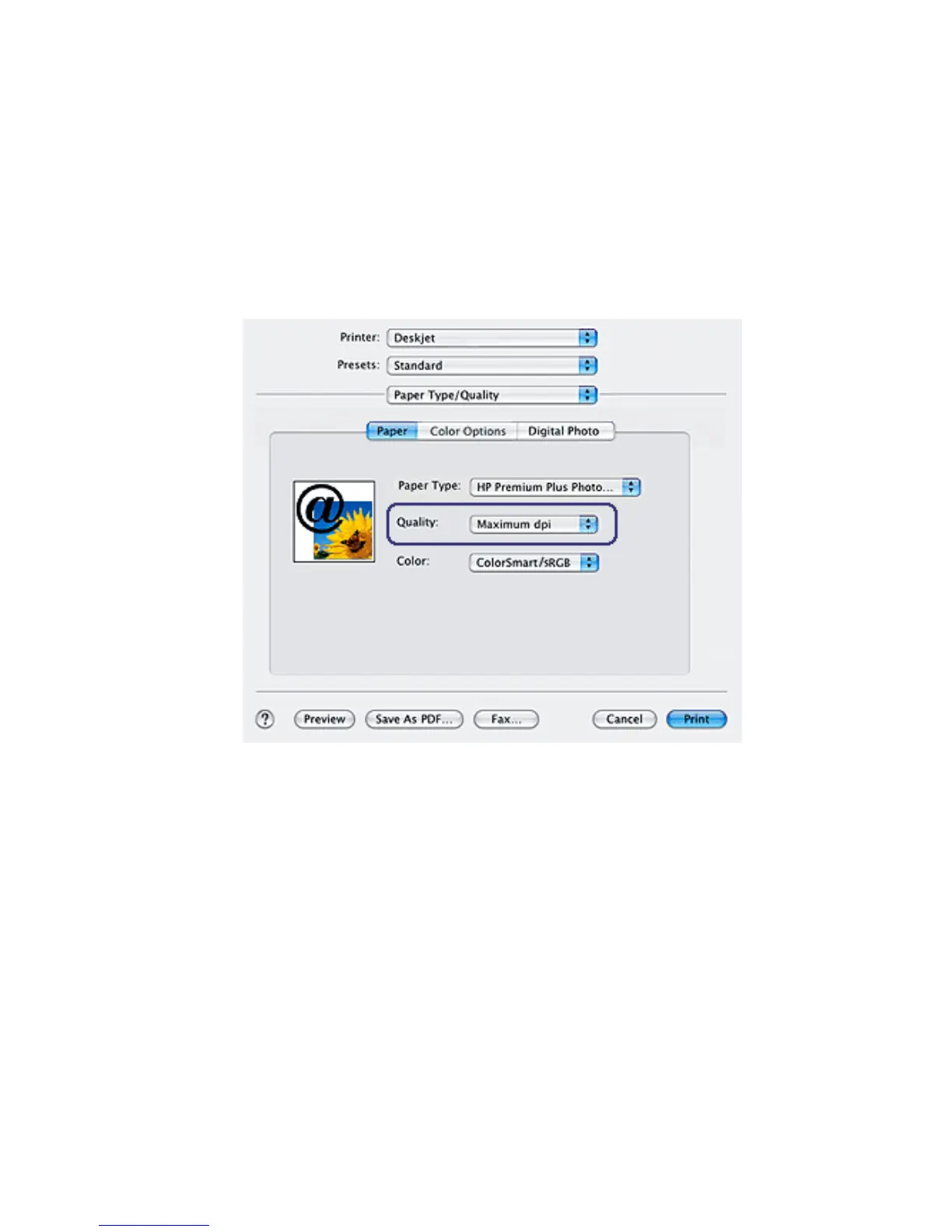 4. In the Quality drop-down list, click Maximum dpi.
