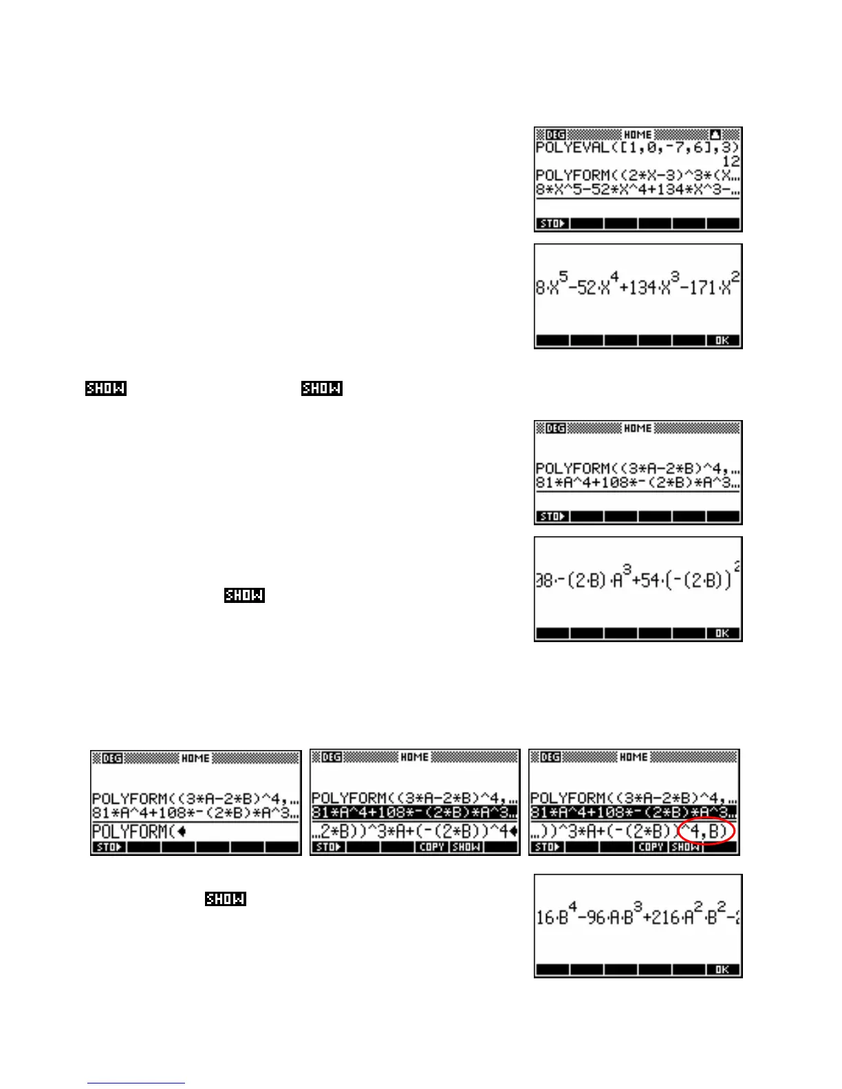 The resulting polynomial is shown both as it appears in the HOME view and as it appears after pressing the
