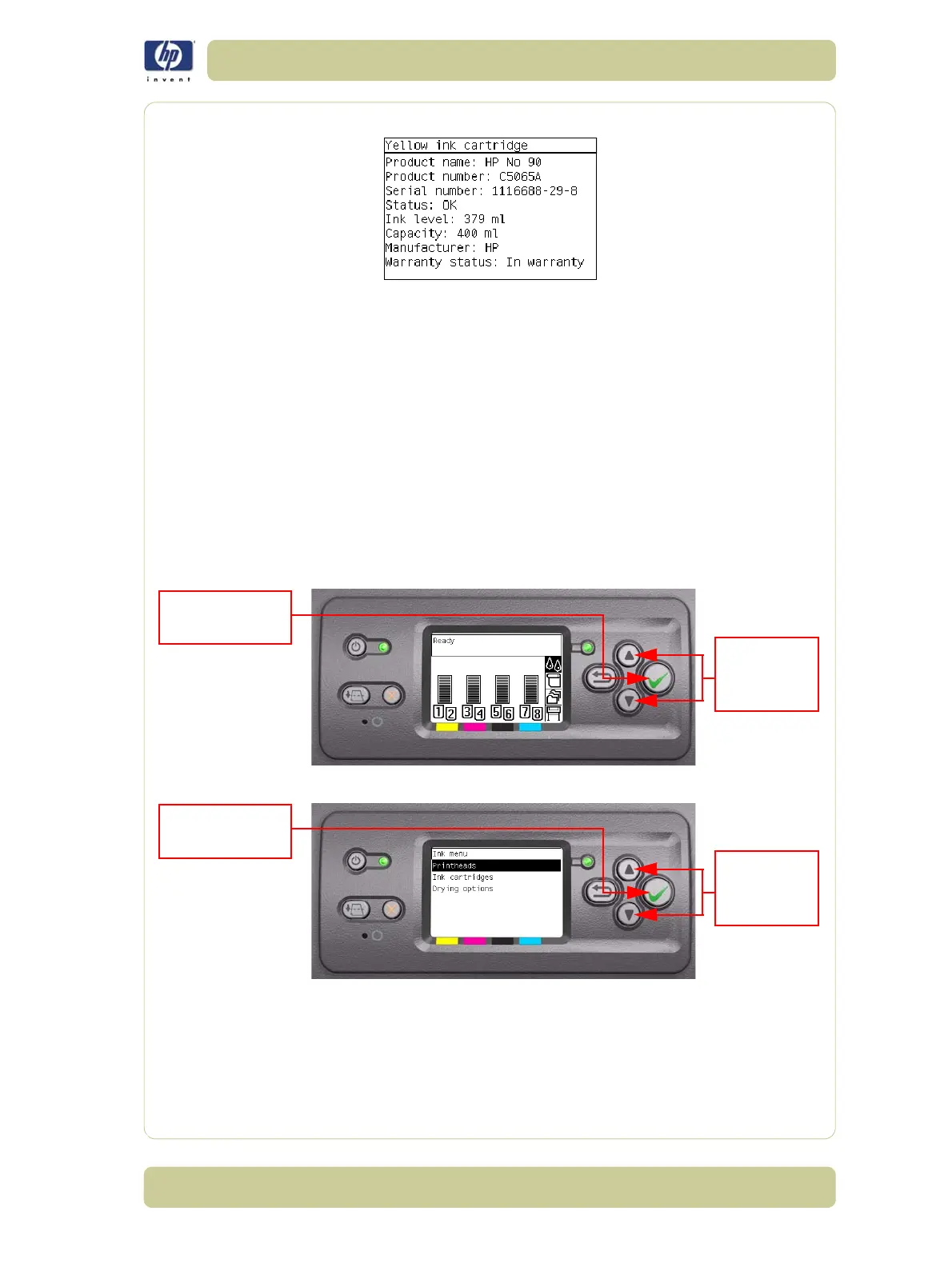 5 The front panel displays information on the selected Ink Cartridge.
