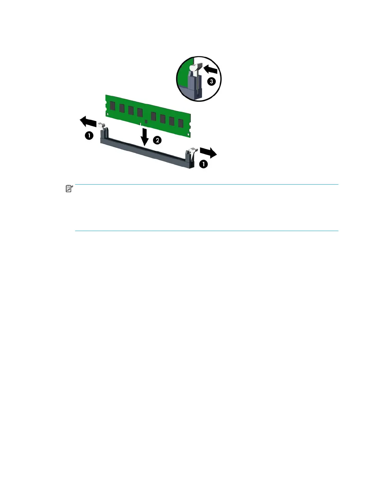 3. Open both latches of the memory module socket (1), and insert the memory module into the socket (2).