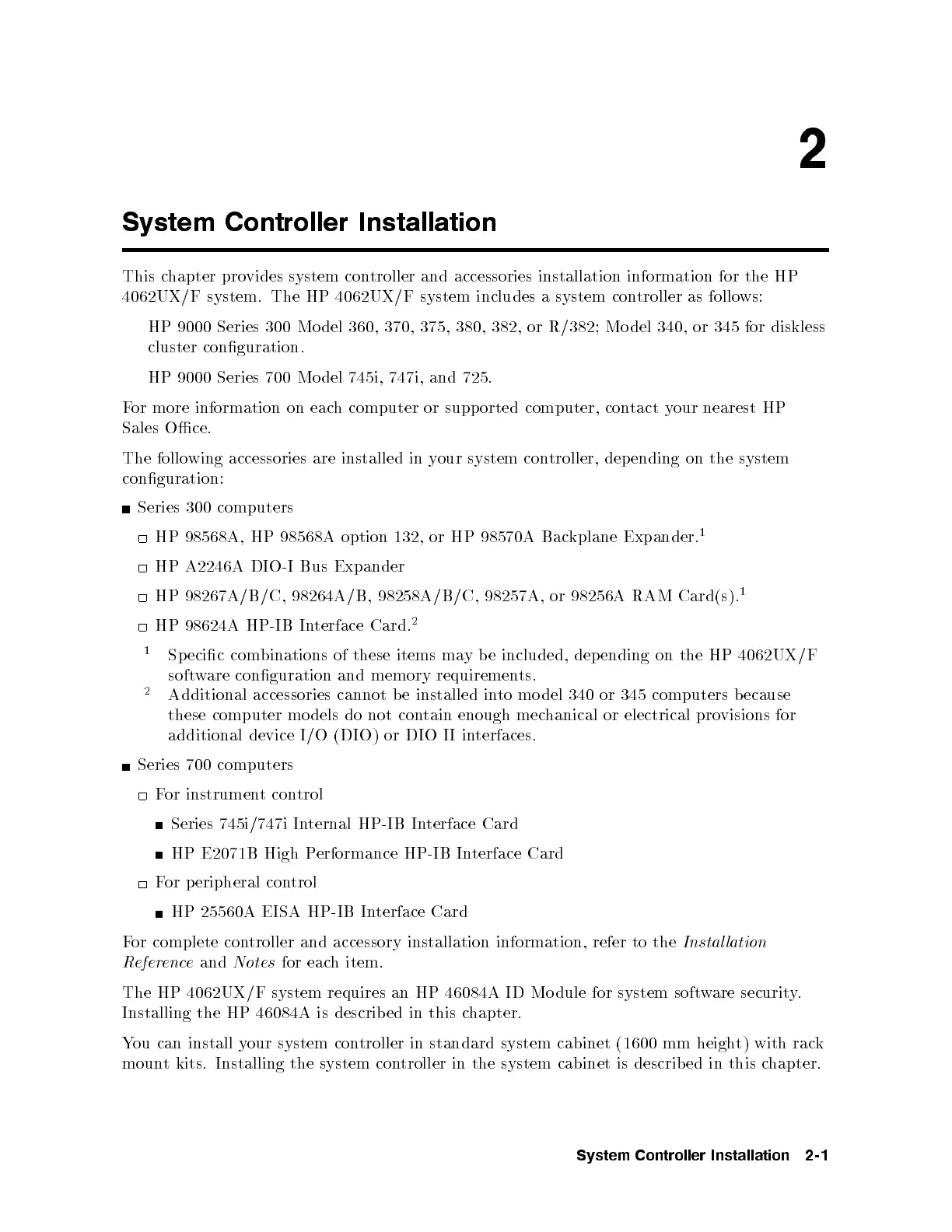 4062UX/F system. The HP 4062UX/F system includes a system controller as follows: