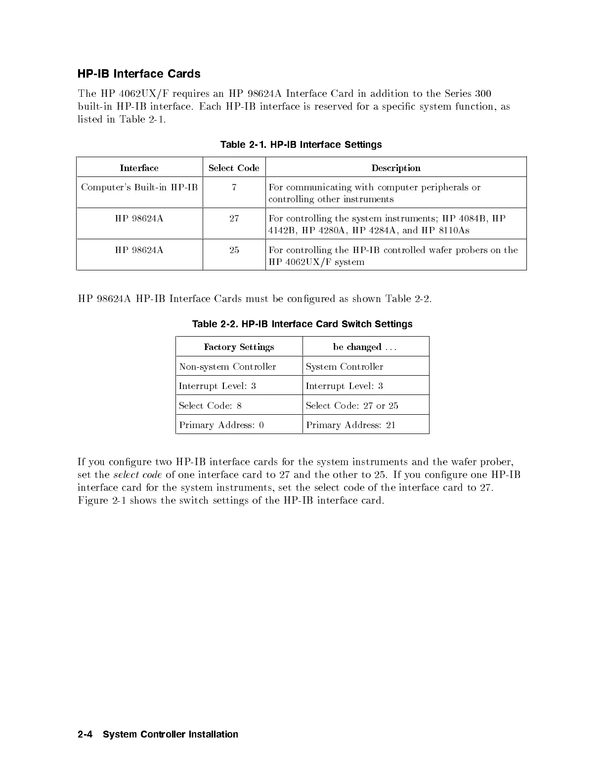 HP 98624A HP-IB Interface Cards must b e congured as shown Table 2-2.