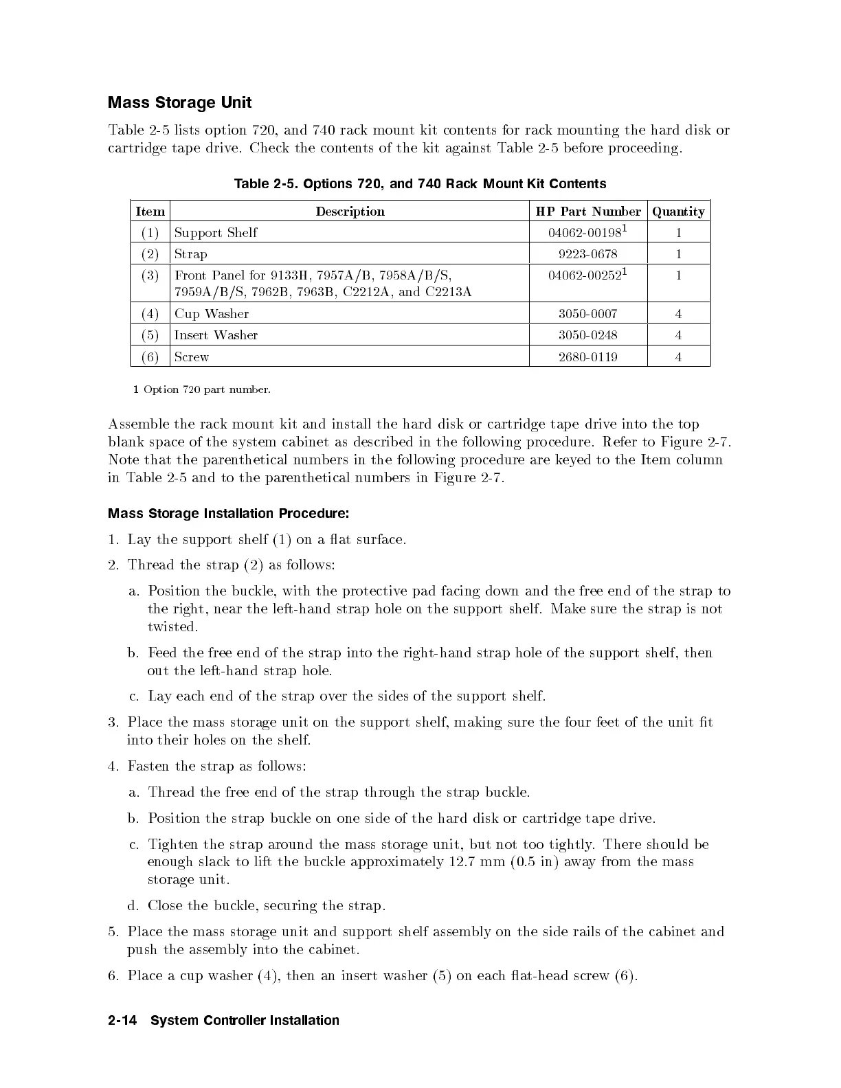 Table 2-5 lists option 720, and 740 rack mount kit contents for rack mounting the hard disk or