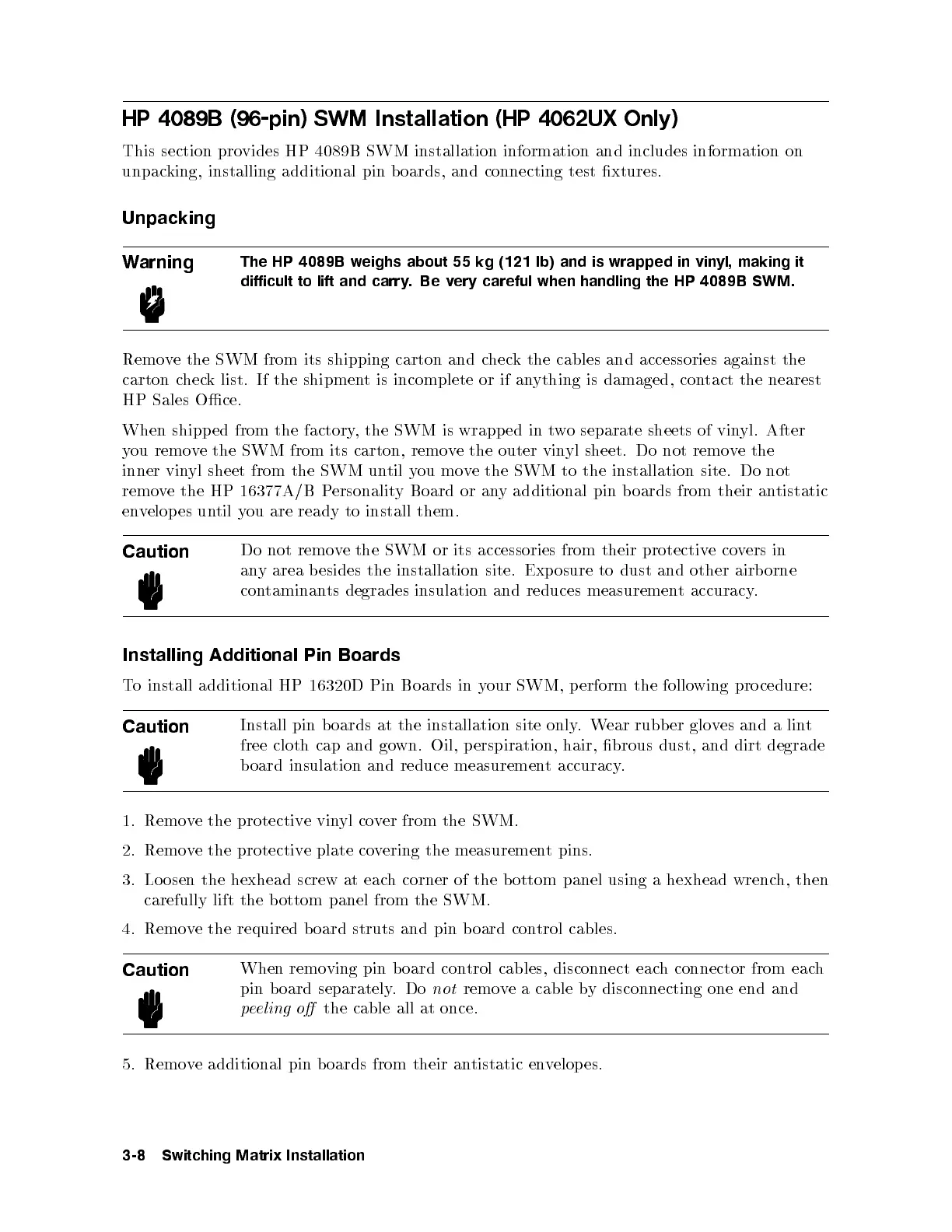 difficult to lift and carry.Bevery careful when handling the HP 4089B SWM.