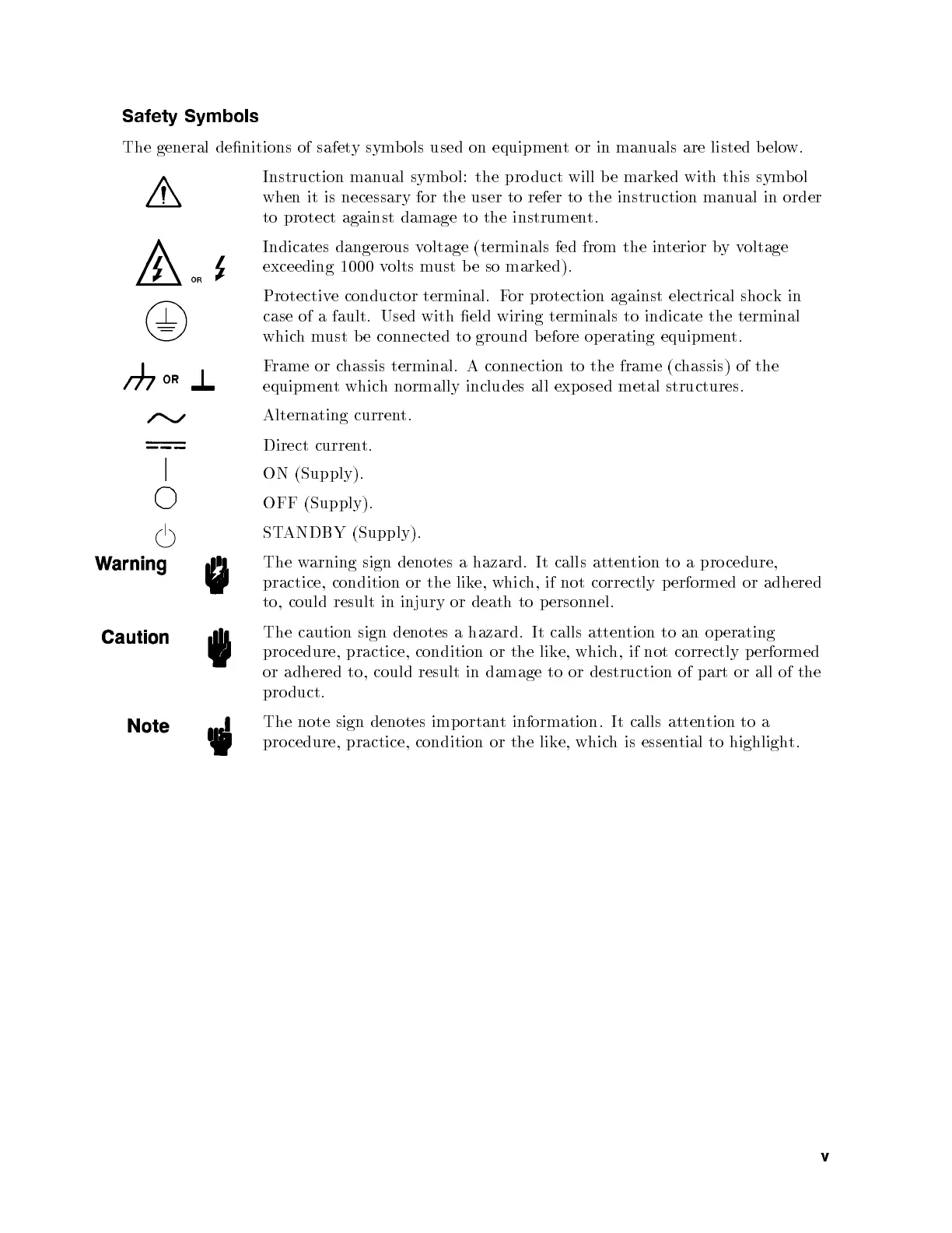 The general denitions of safety symbols used on equipment or in manuals are listed below.