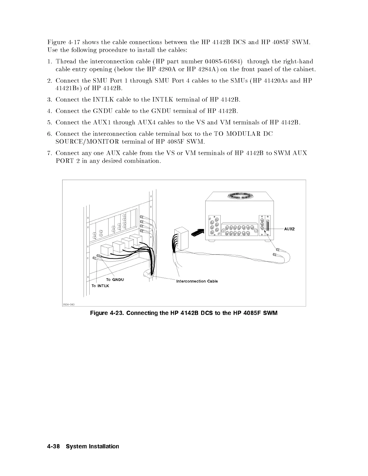Figure 4-17 shows the cable connections between the HP 4142B DCS and HP 4085F SWM.