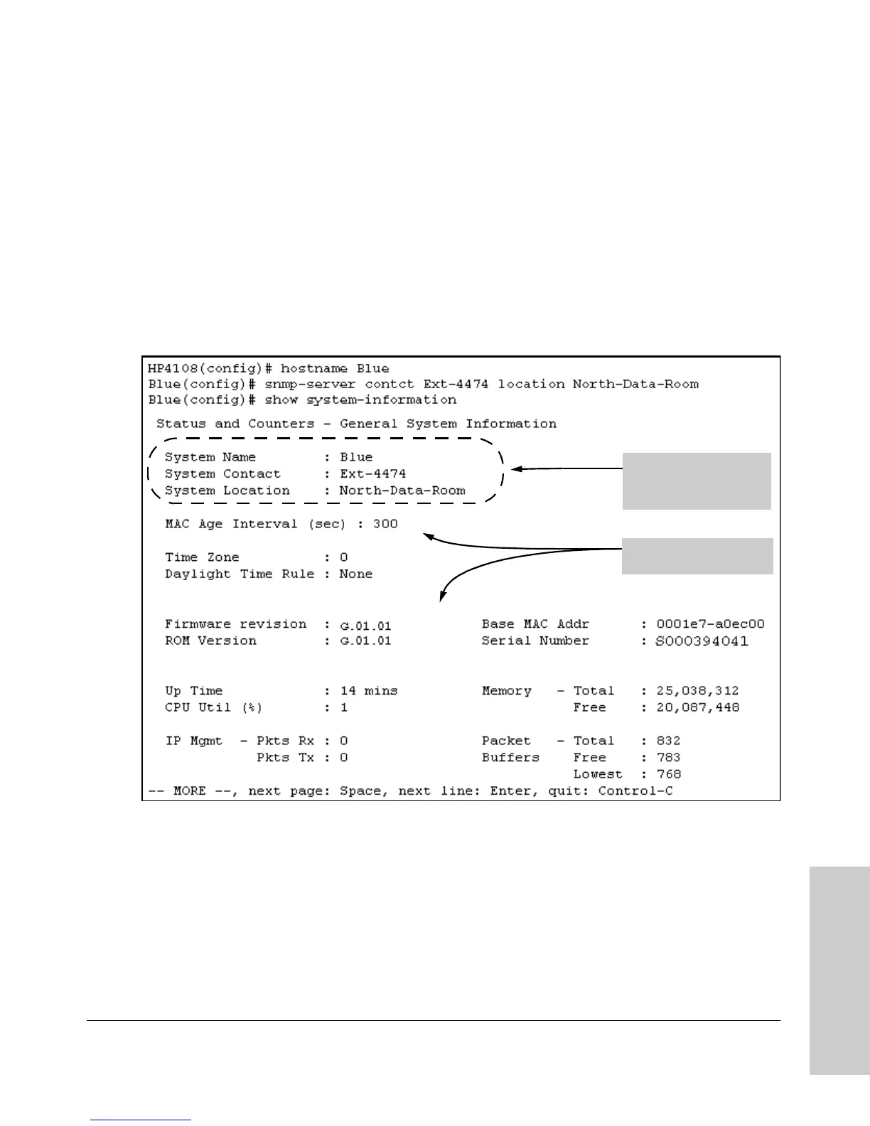 For example, to name the switch “Blue” with “Ext-4474” as the system contact,