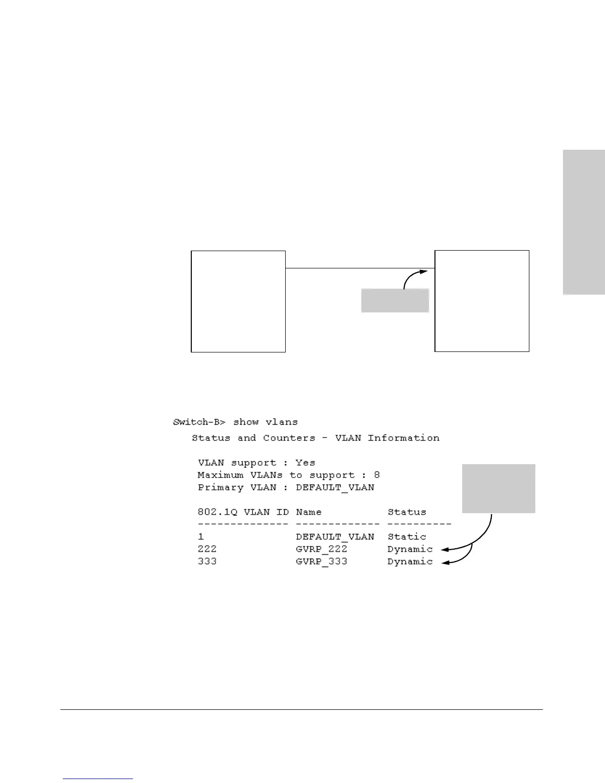 For example, in the following illustration, switch “B” has one static VLAN (the