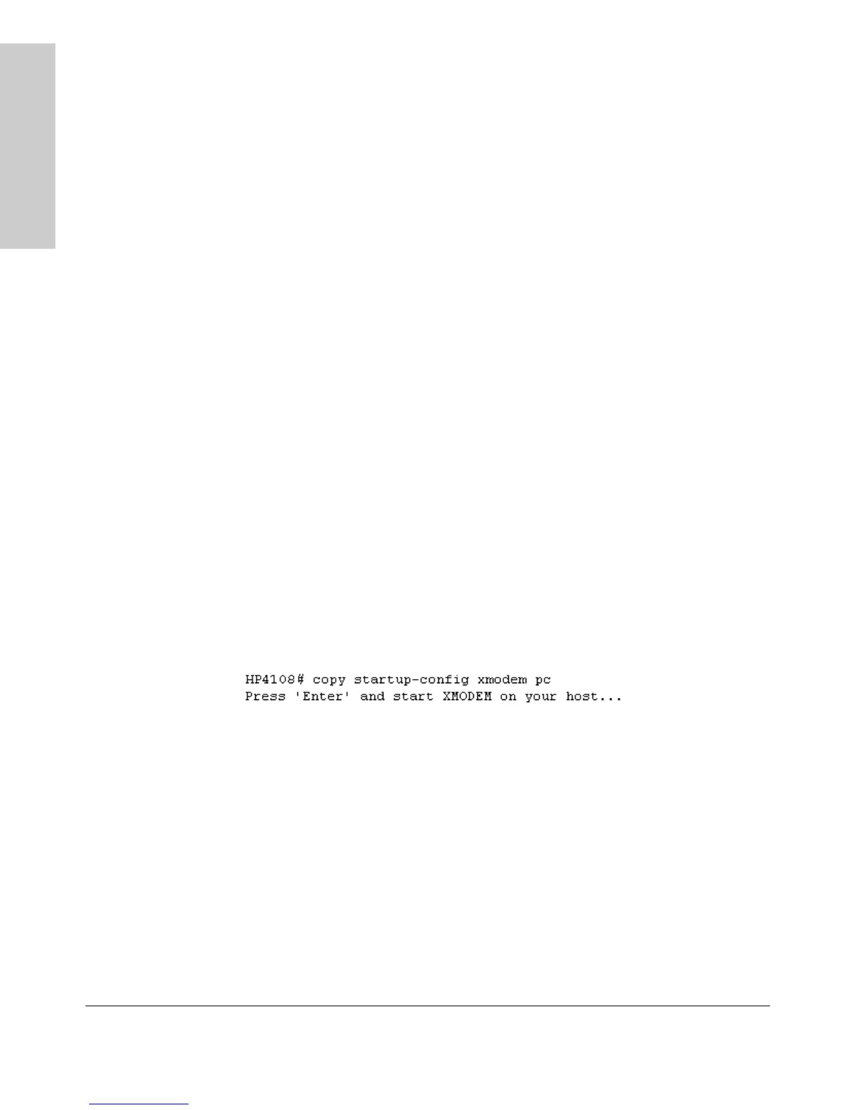 Syntax: copy <startup-config | running-config> xmodem <pc | unix>