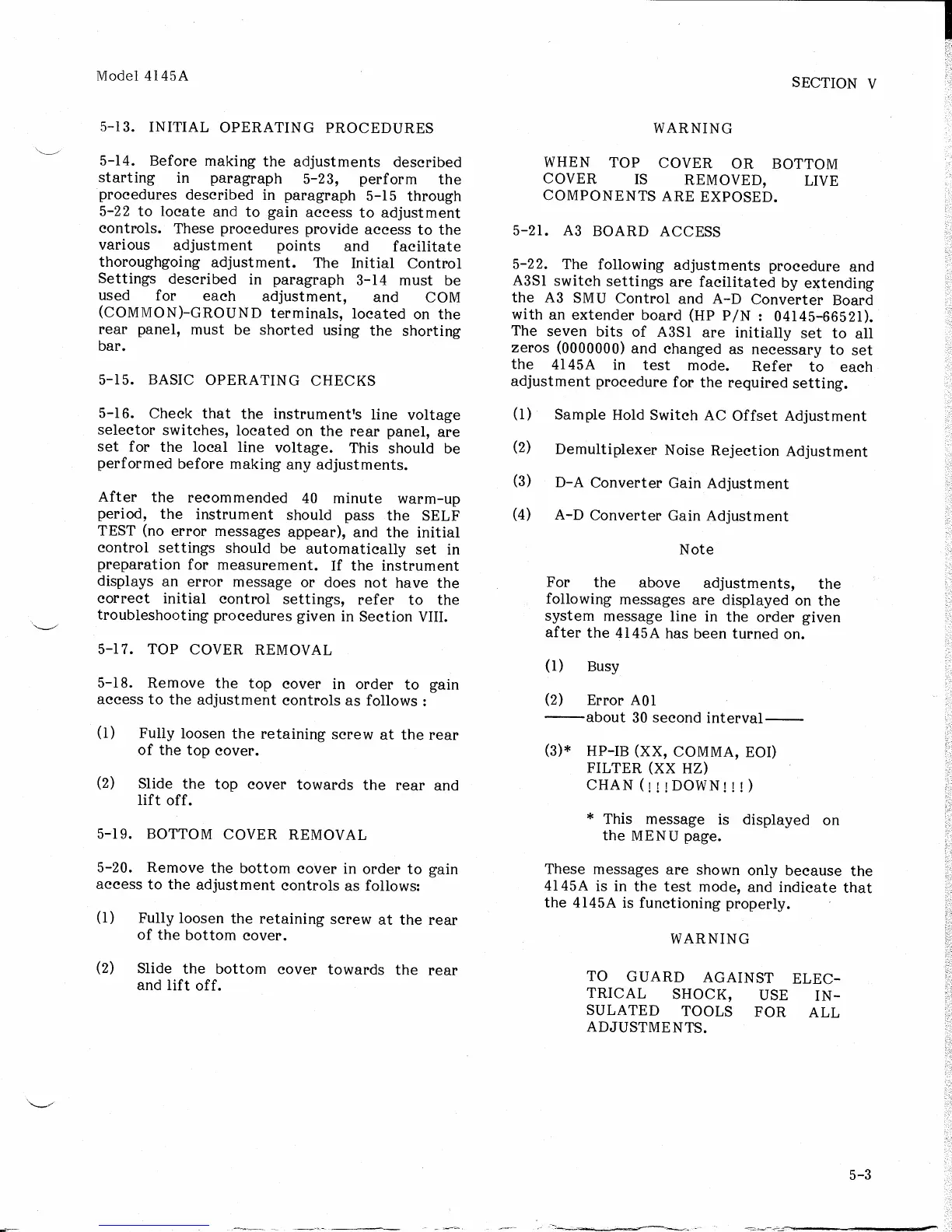 HP 4145A - 5-13. Initial Operating Procedures; 5-15. Basic Operating Checks; 5-17. Top Cover Removal; 5-19. Bottom Cover Removal