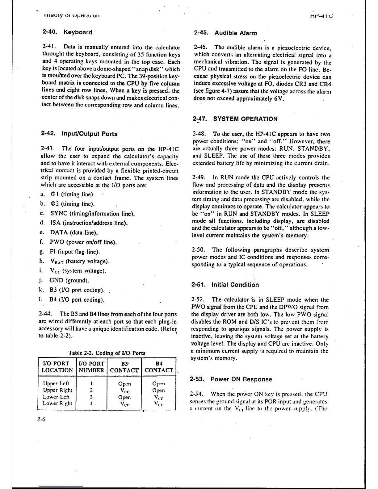 HP 41C - System Operation; Input;Output Ports; Initial Condition; Power on Response