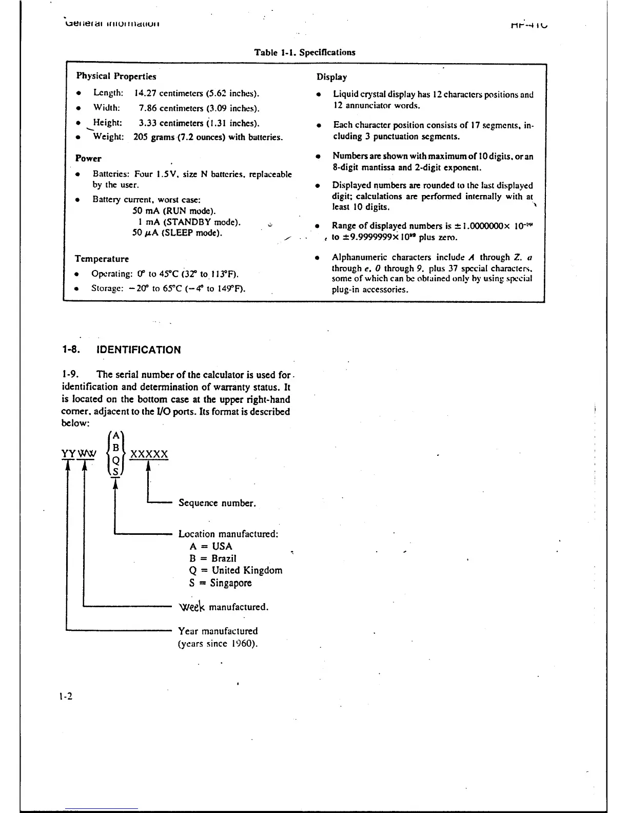 HP 41C - Identification; Specifications