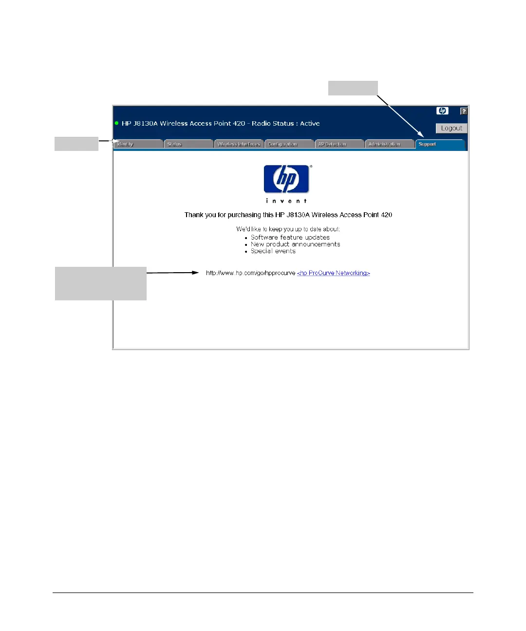 The home page for the access point’s web browser interface is the Support tab.