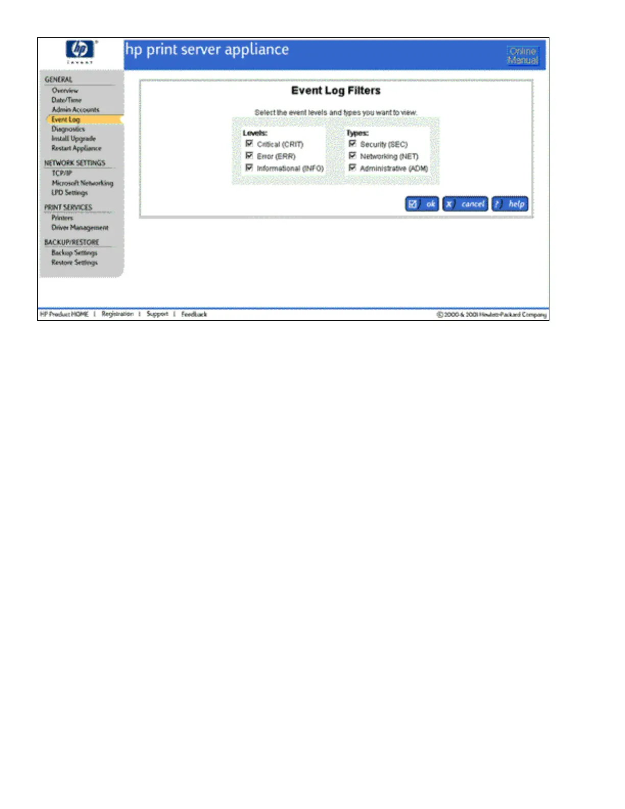 The following filters can be selected for events. One or more Type filters and one or more Level filters must be