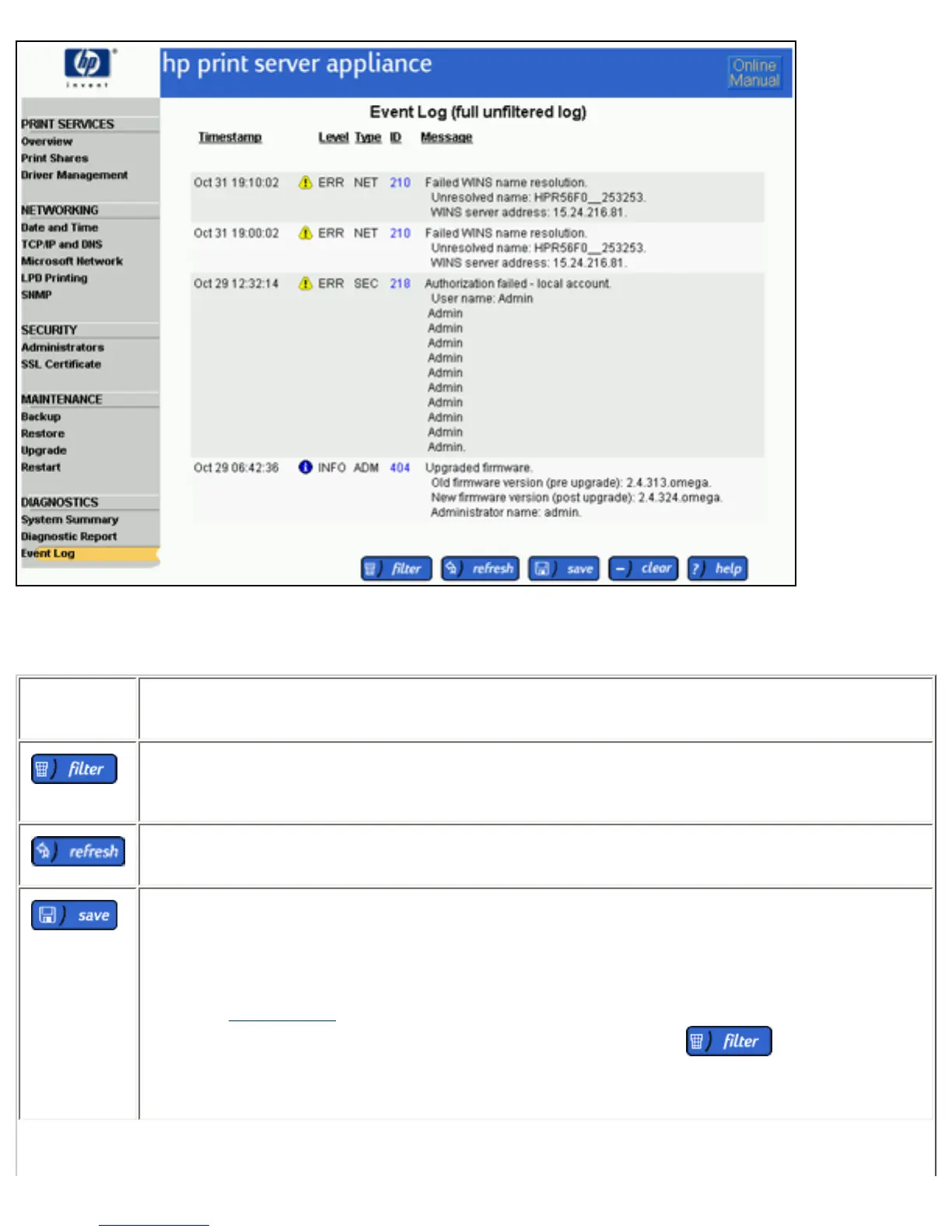Displays the Event Log Filters page where filters can be selected, based on the message level