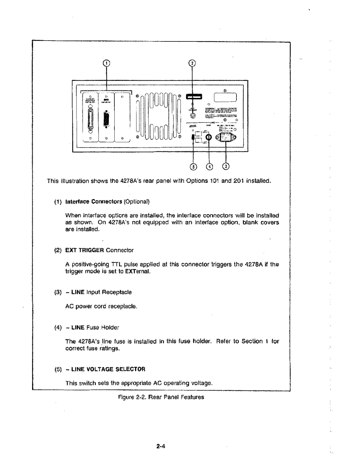 This illustration shows the 4278A's rear panel with Options 101 and 201 installed.