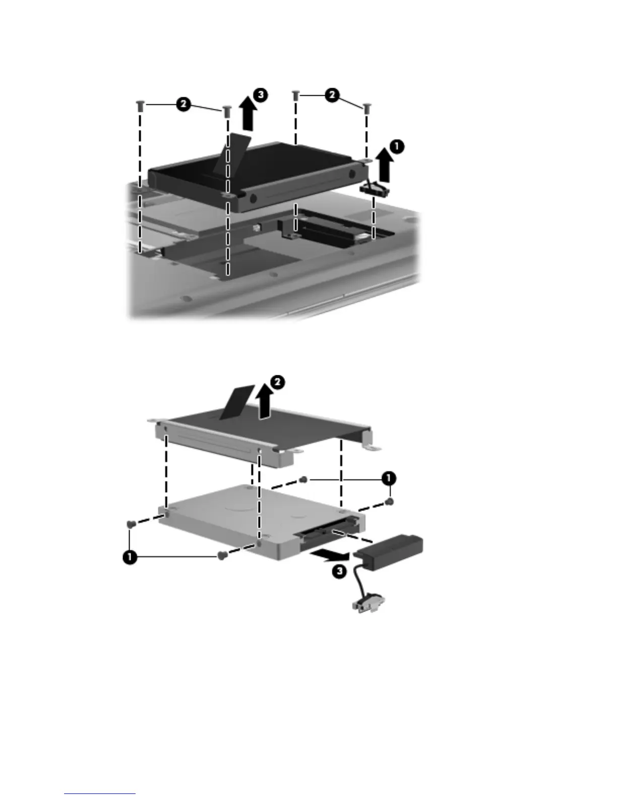 7. If it is necessary to replace the hard drive screws (1), the hard drive bracket (2), or the hard drive