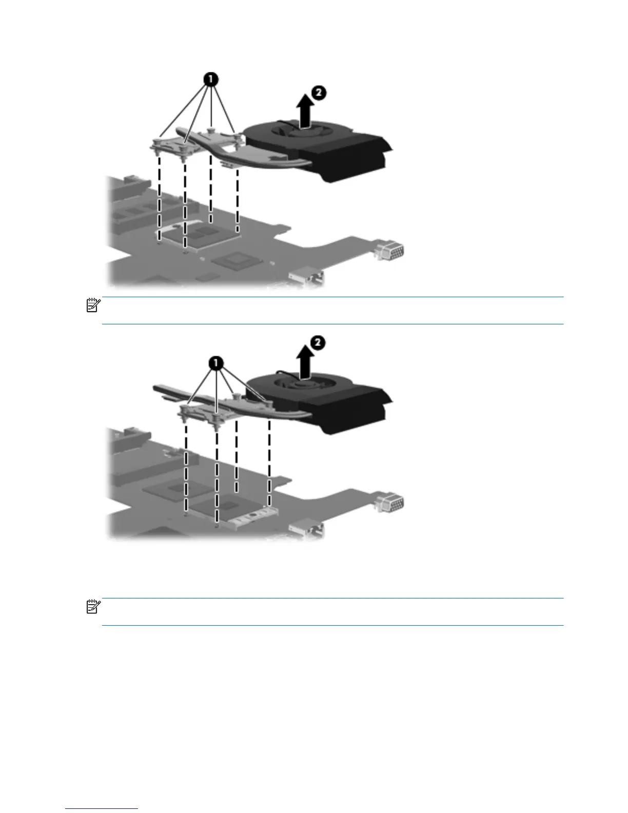 NOTE: The following illustration shows the fan/heat sink assembly removal process on a computer