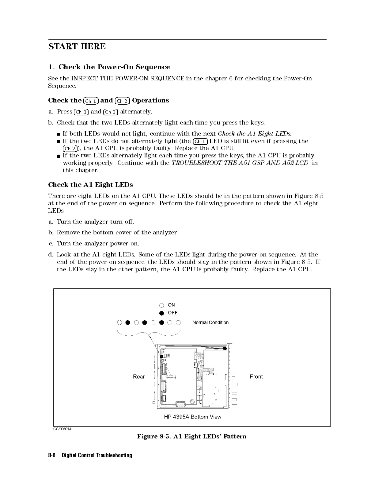 There are eight LEDs on the A1 CPU. These LEDs should be in the pattern shown in Figure 8-5