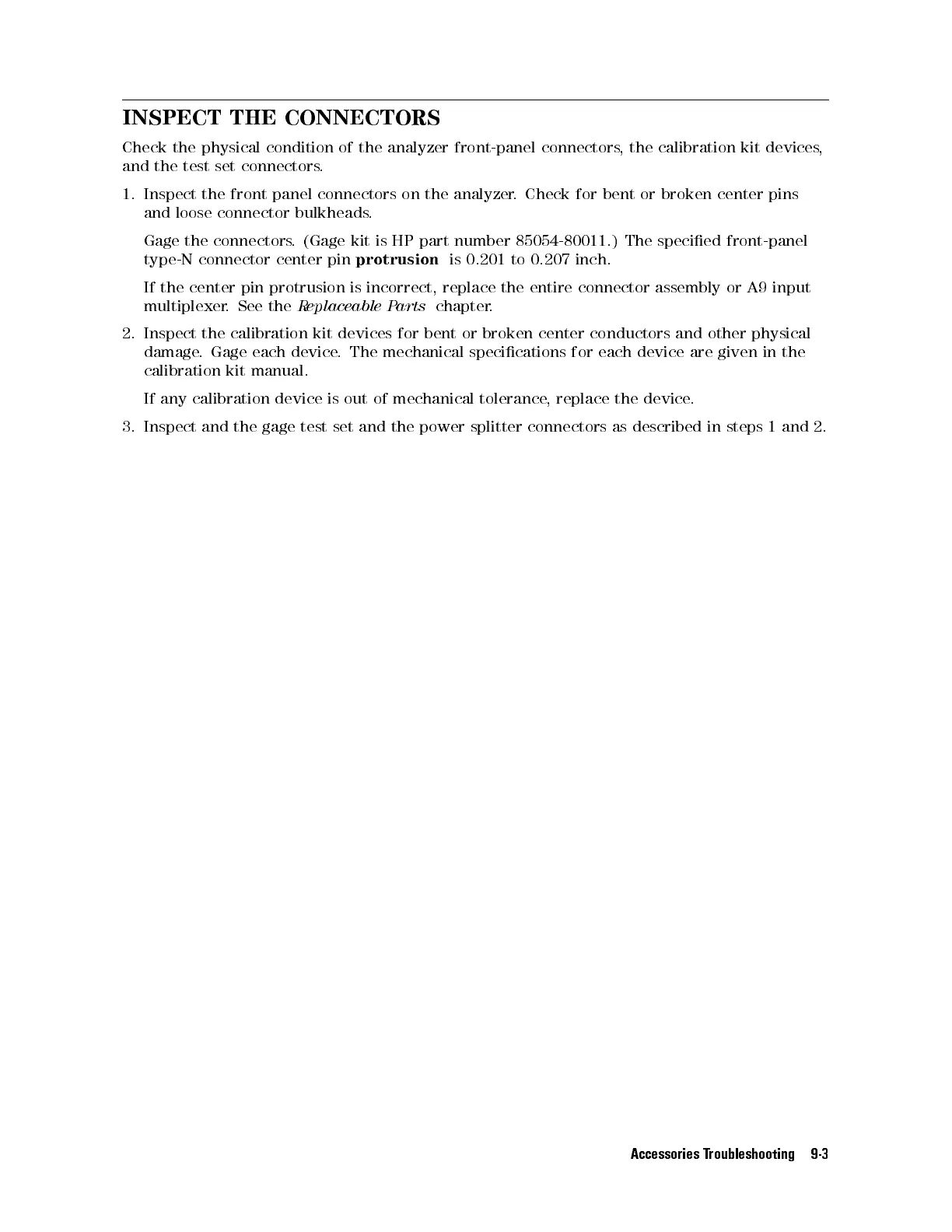 1. Inspect the front panel connectors on the analyzer. Check for bent or broken center pins
