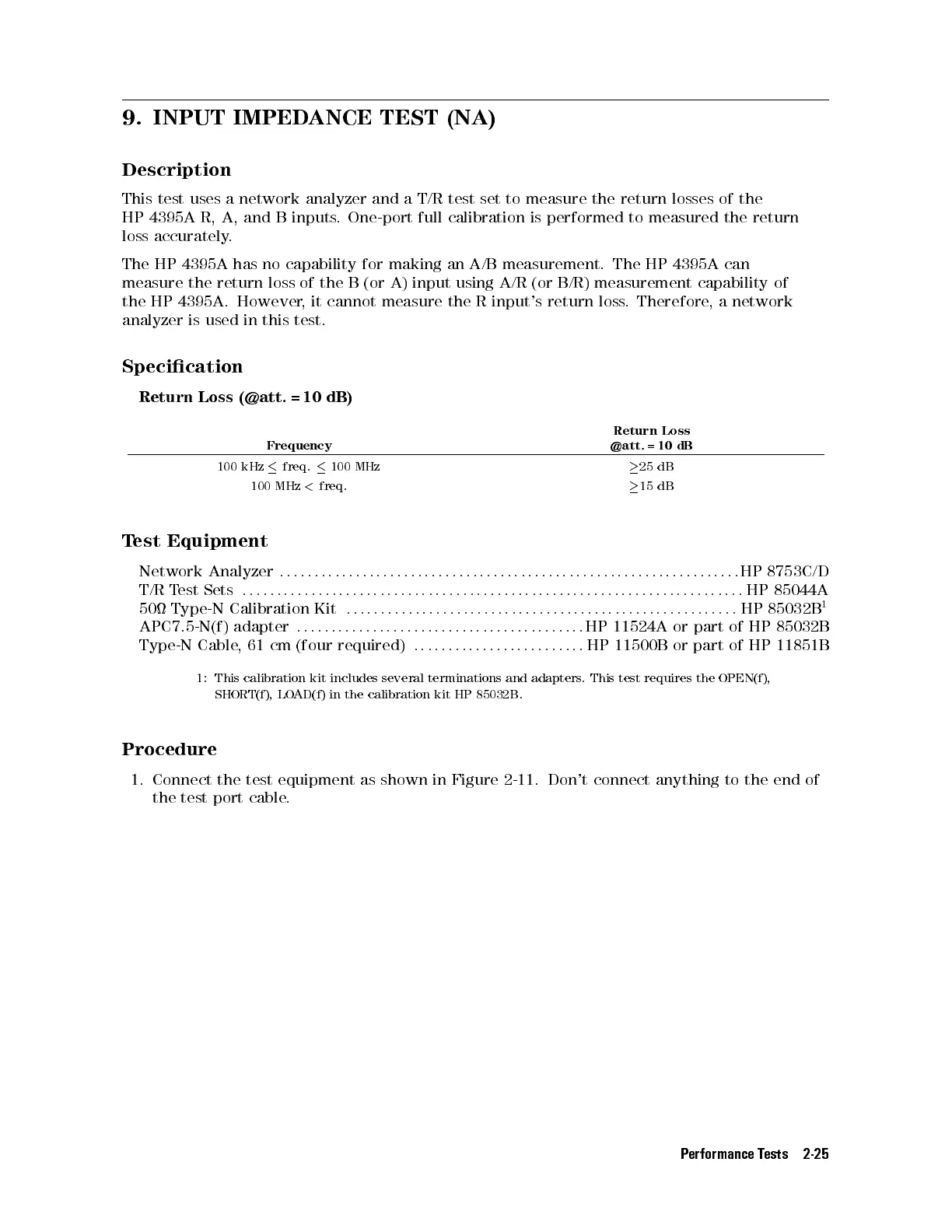 HP 4395A R, A, and B inputs. One-port full calibration is performed to measured the return
