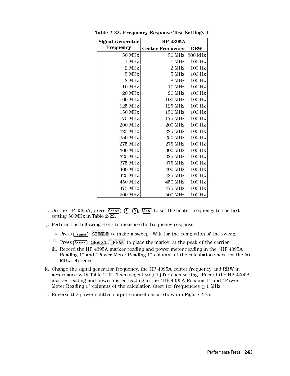 accordance with Table 2-22. Then repeat step 1-j for each setting. Record the HP 4395A